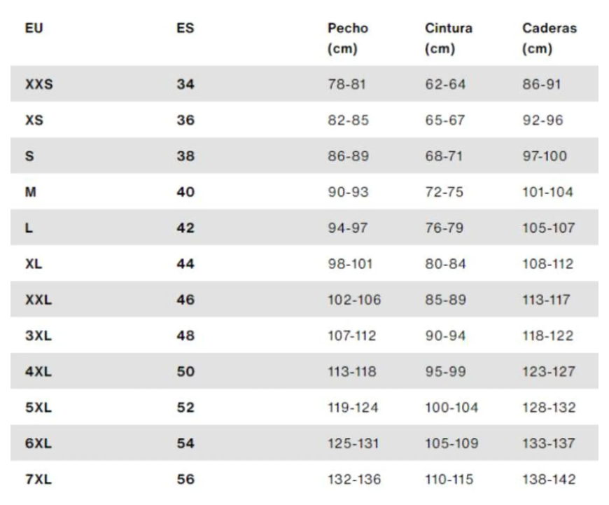 En la tabla se distinguen 5 columnas, la talla europea, la talla española, la medida del pecho, la de la cintura y la de las caderas, todas ellas en centímetros. Las medidas de la tabla que mostramos a continuación sirven como referencia para adquirir prendas de arriba.